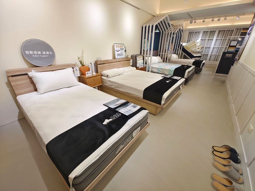 ▼GAGU 販售的家具主要以北歐風格為主,GAGU SLEEP 台北中山睡眠體驗店整體也是清爽明淨配色,展售環境明亮溫馨,現場的都是暢銷款床墊,通通都可以試躺。如果不住台北又想要試躺 GAGU SLEEP 床墊的話,GAGU 北歐家具工廠五股、汐止、楊梅、台中、台南店都可以試躺。