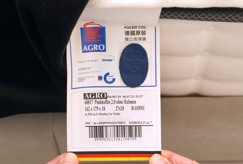 ▼德國 AGRO 鈦銅鋼獨立筒彈簧每一個都會有原廠出產的條碼與 AGRO 的標章,等於是這個獨立筒彈簧的身分證,掃描後會連到德國總公司讀取資訊。