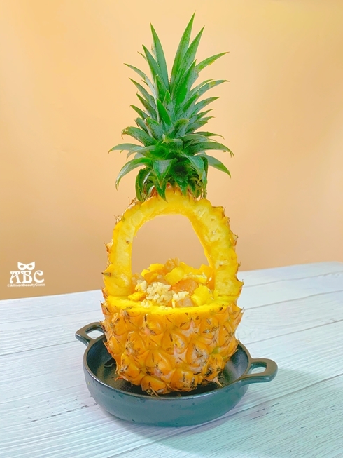 下面這顆鳳梨的切法參考了型男大主廚節目裡,阿基師的教學,鳳梨花籃切起來真的很華麗!不過建議大家要選大顆一點,圓潤一點的鳳梨會比較好切喔!蝦仁炒飯中加入鳳梨果肉,吃起來更清爽了!