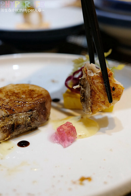這個擺盤好法式喔~除了土魠魚之外還有料理長做的醋凍佐蜂蜜芥子醬,搭配烤地瓜、漬物和蘿蔔葉,視覺上先讓眼睛飽餐一頓啦!