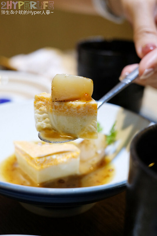 最下層的海膽豆腐是以日本空運的海膽製作而成,光從外觀來看就是一種精緻的視覺享受,吃起來很像蛋糕的綿密口感,但嚐起來又帶有新鮮的海味! 干貝外層煎的焦香,中間還是保持軟嫩口感,底下搭配的胡麻醬是料理長特製的,口味吃起來有點鹹甜的感覺。