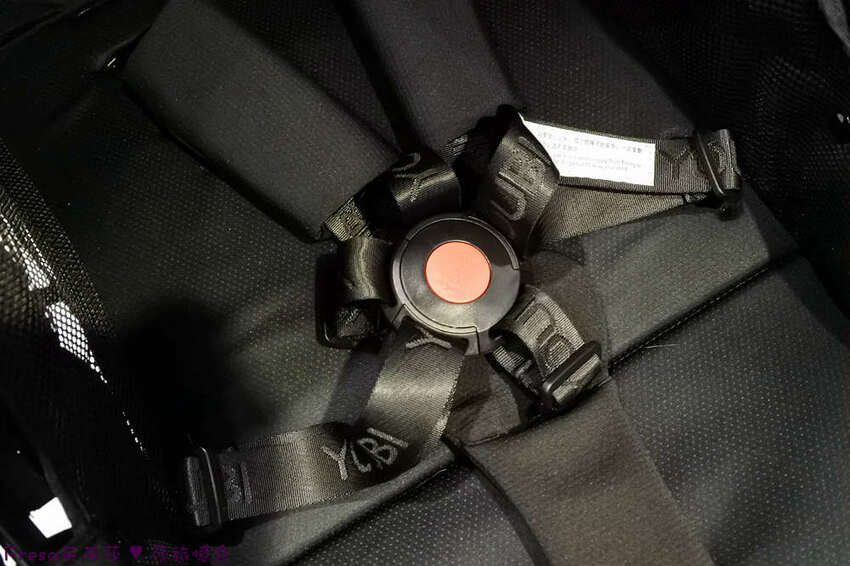 確認五點式安全帶有確實扣緊,推車散步過程也能放心.