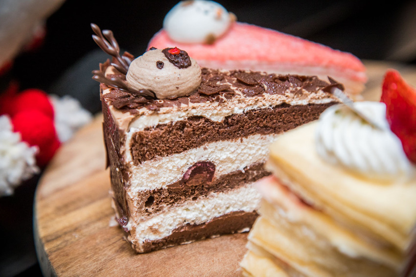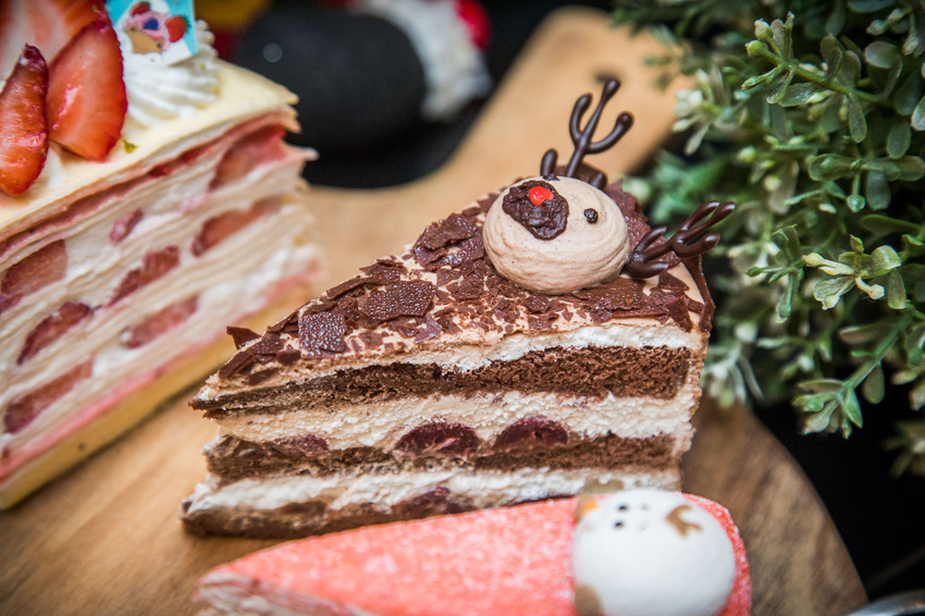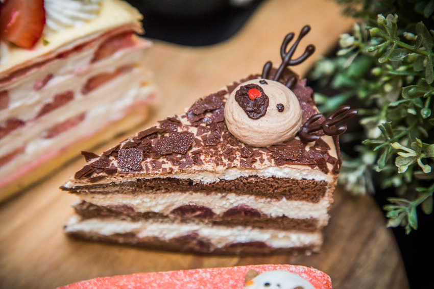麋鹿黑森林,這款蛋糕也是可愛死了!巧克力做成的麋鹿還有一個紅紅的鼻子,仔細看,麋鹿角也是用巧克力做的,還原度超高R~