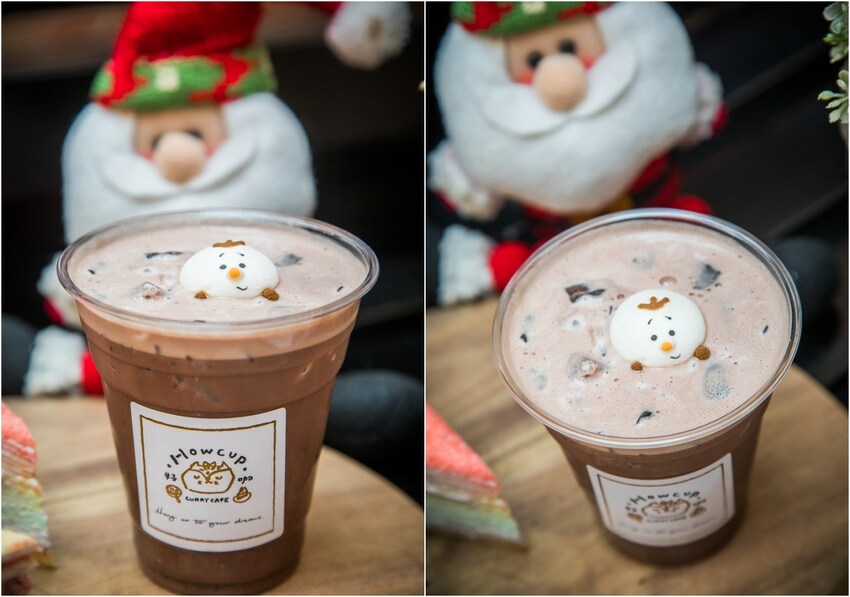這次買了三個蛋糕、還有一杯漂浮雪寶巧克力,這捨不得吃呀,因應聖誕節好咖也在蛋糕上加了聖誕元素,雪人彩虹千層、麋鹿黑森林還有季節限定大湖草莓千層!