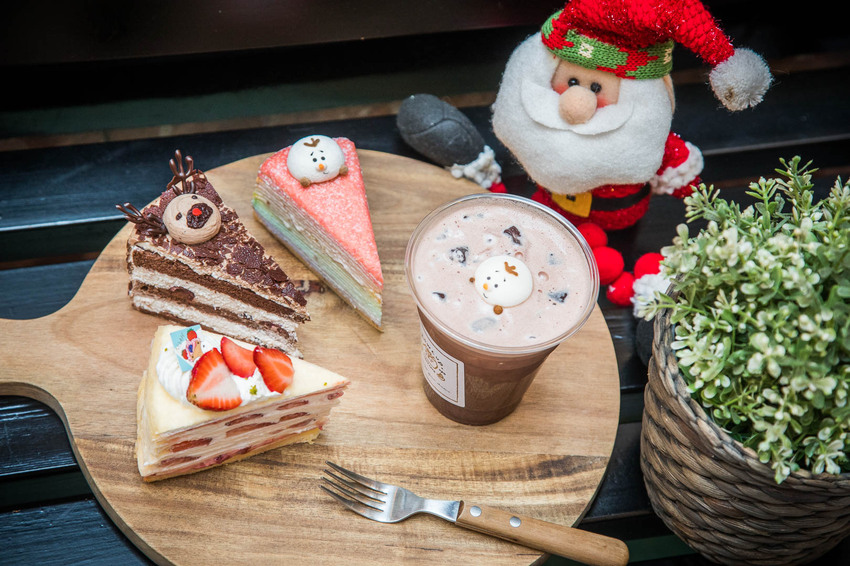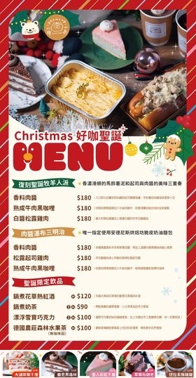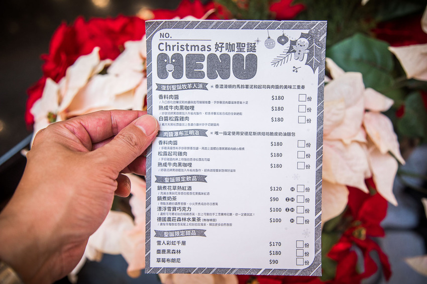 這次好咖推出的聖誕版菜單,不僅好拍還很好吃呢,牧羊人派、肉醬瀑布三明治是這次的亮點,只有在這裡販售,另外甜點有大湖草莓千層、雪人彩虹千層、麋鹿黑森林、提拉米蘇罐罐、草莓布朗尼,飲品則有鍋煮花草熱紅酒、漂浮雪寶巧克力