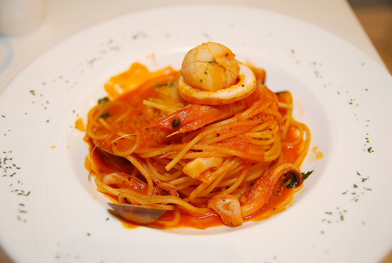 點餐時,規定一人要點一杯飲料,我點西西里蕃茄海鮮麵250元,