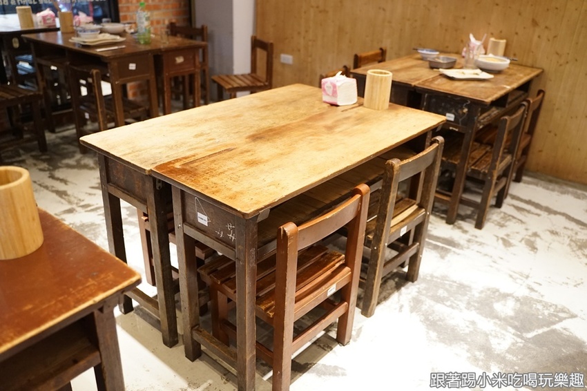 室內有兩種不同的桌子,前面也是學生的桌椅。