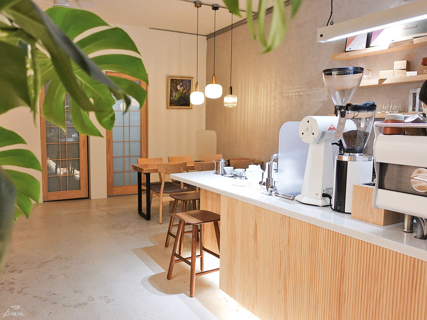 往左滑開拉門,沈靜的空間飄逸著咖啡香,播放著輕柔的日文曲目,營造日式恬靜高雅氛圍。以松木為主調,輔以白、灰與點綴的綠,與店面外觀一致的風格。進入門口的左手邊是長型咖啡吧台製作區,最前方作為點餐櫃檯,尾端則是咖啡師手沖咖啡區,且尾端的部分亦有設置餐椅,歡迎客人與咖啡師近距離交流。