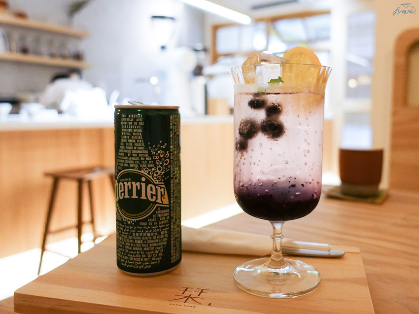 藍莓氣泡飲,為店家自製藍莓醬搭配法國沛綠雅Perrier氣泡天然礦泉水所調製的氣泡飲,視覺上相當清爽解憂,藍莓風味不過甜喝起來沁涼舒暢。