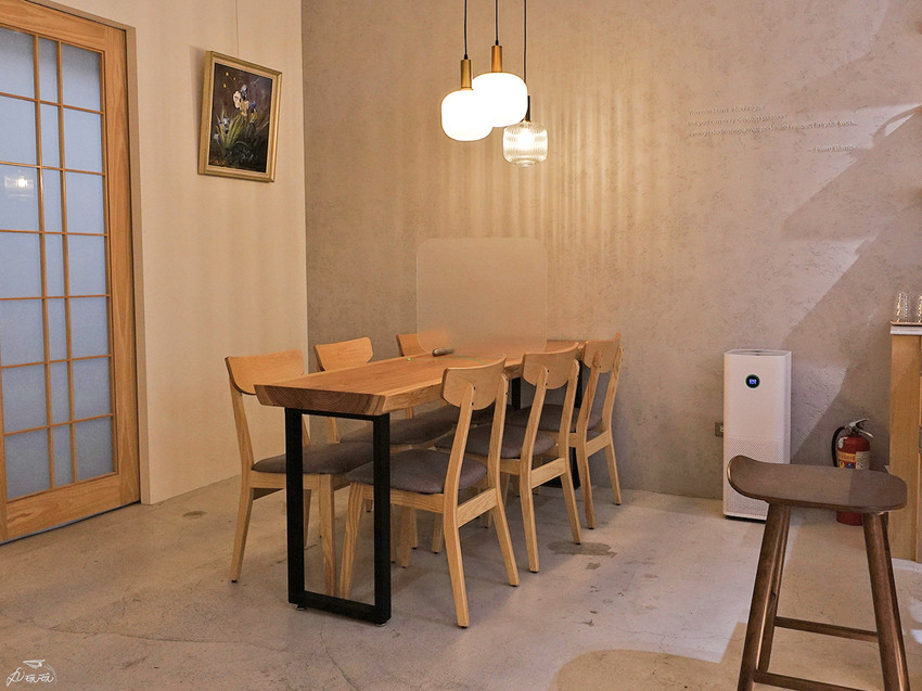吧台區的後方是六人長桌,適合三五好友聚會聊天。另外也注意到,右側牆面及地板跳色使用不同色調的水泥灰,並添加了不同紋路觸感,增加了變化性豐富了空間質感。