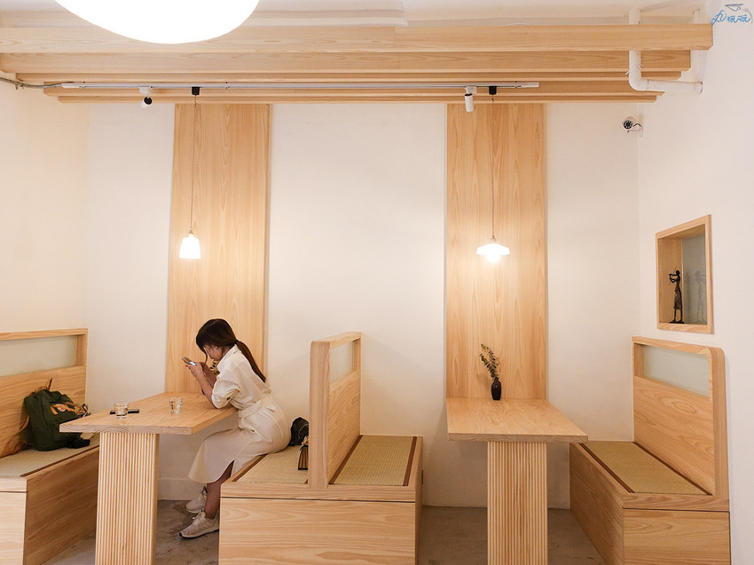 另一側還有兩處固定式四人桌,桌椅設置上呈現不同的風格,板材從天花板延伸下來的設計,呈現不同的感官視覺;座椅同樣採用松木材,然而在座椅的部分使用榻榻米,整體更為貼近日式風格,讓人眼睛為之一亮。椅子的腳邊也都帶有插座。