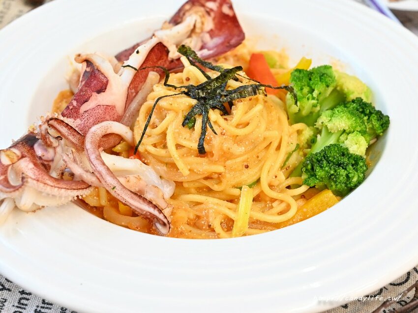 牛胖の手作鹽可頌除了白醬、紅醬及青醬外,還有明太子義大利麵,搭配一整隻的新鮮中卷,看起來超霸氣,還沒入口糖糖就被那撲鼻而來的香氣給吸引住啦~