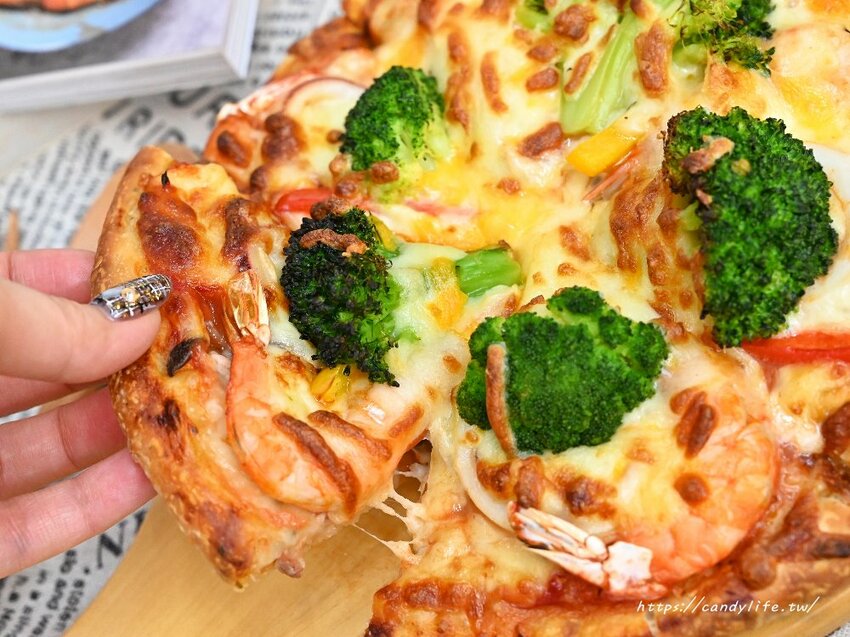 牛胖の手作鹽可頌不只義大利麵、燉飯,還有現烤手作披薩,手工薄皮披薩,抹上酸甜紅醬,鋪上鮮蝦、中卷、花椰菜、甜椒等新鮮食材,最後將起司整個鋪滿滿,上桌時香氣四溢,畫面看起來也超誘人~