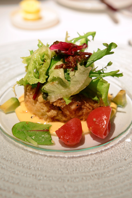 開胃菜我選擇酥炸軟殼蟹佐海膽醬,上頭的滿滿的生菜蠻爽口,