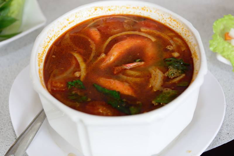 第五道酸辣蝦湯,紅通通的辣油,當然是不會辣,香茅味很重,