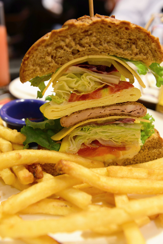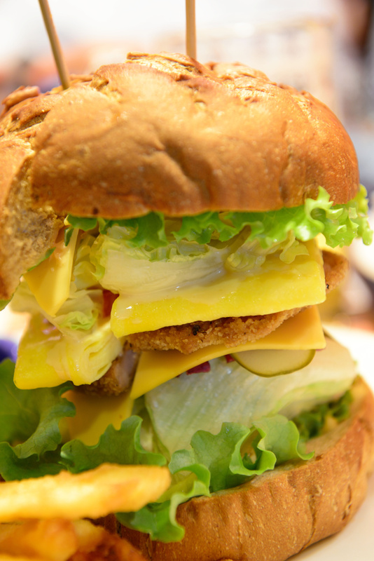 麵包體以雜糧麵包搭上生菜、牛番茄、起士片、素肉、蛋包、酸黃瓜...等,