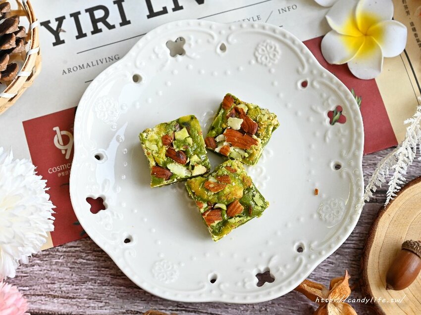 中間夾層綠油油的抹茶牛軋糖,使用小山園抹茶粉製作,抹茶香氣非常濃厚,甜而不膩,裡頭多了杏仁果的加持,非常耐吃,喜歡抹茶的朋友千萬別錯過啦