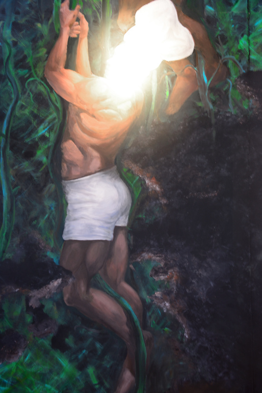 休息片刻望遠方看去,發現有好多裸身廚師往樹上爬的牆面,