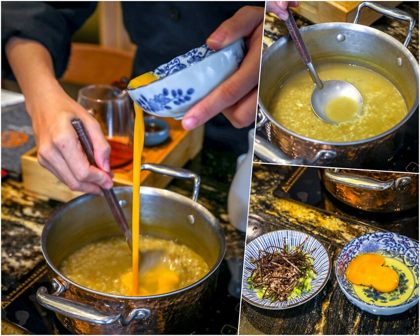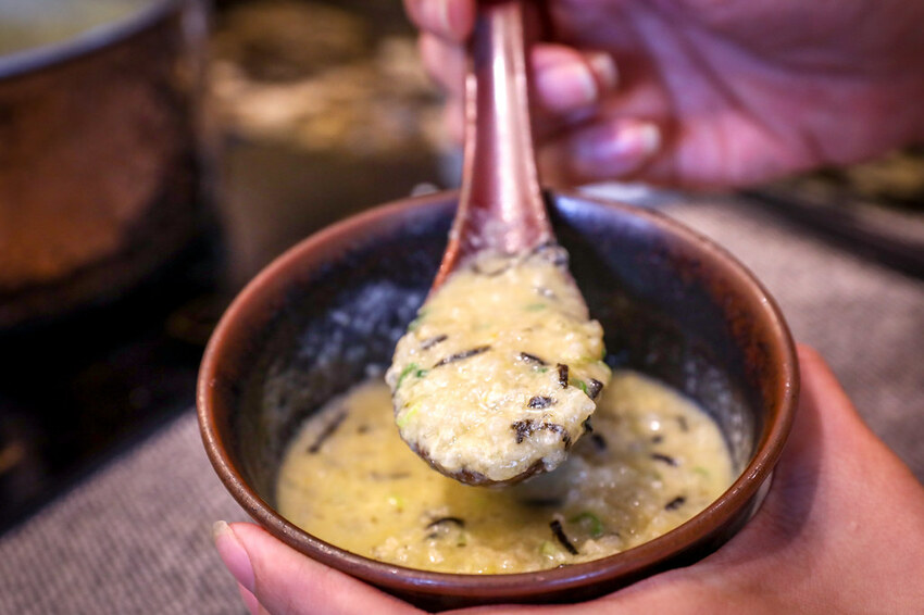 集聚海鮮甜味的湯底,在店員的巧手下,一碗濃郁鹹香的雜炊完成囉~其實吃到這邊已經好飽好飽,但這太好吃還是吃光。