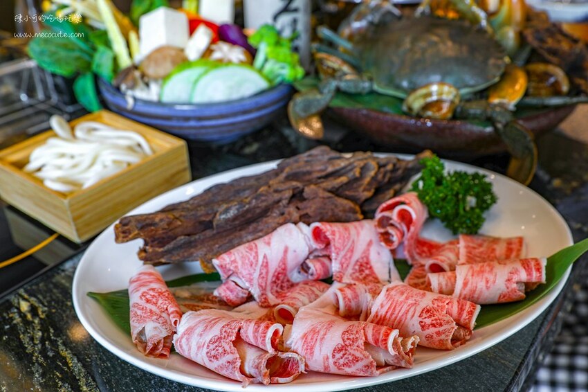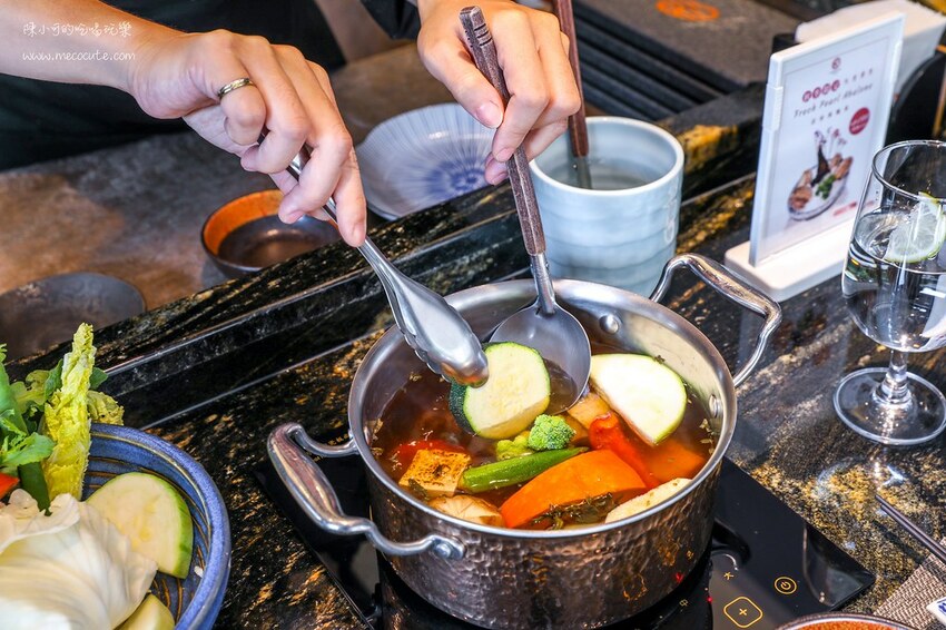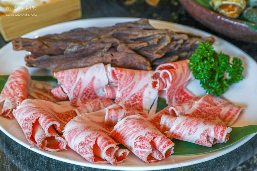 黑毛和牛直接攻頂,沒有浮誇擺盤,店員提醒趕緊開動,他要準備涮肉囉~細緻的油花讓人想像牛肉的軟嫩。