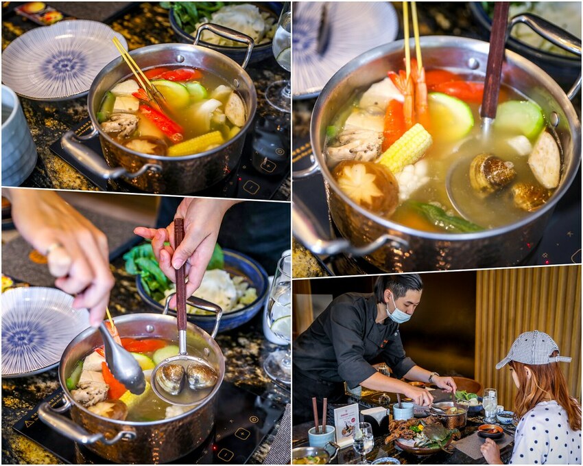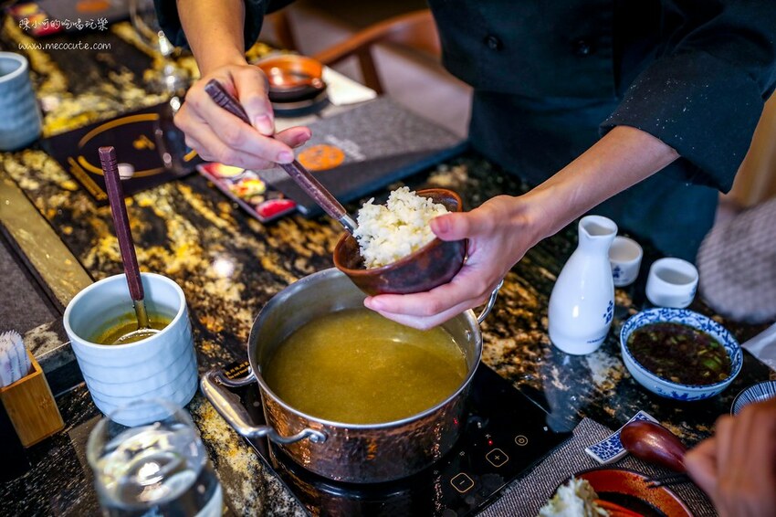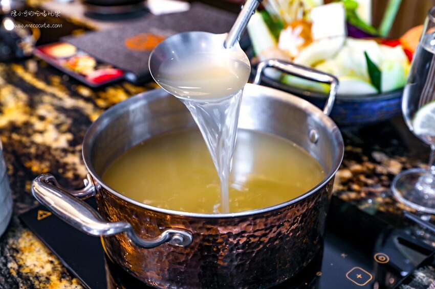 甘醇濃郁的昆布湯底以老母雞、豬大骨、柴魚片和昆布熬製,套餐如果有選擇海鮮搭配這湯底很適合,餐後還能煮粥享用雜炊。