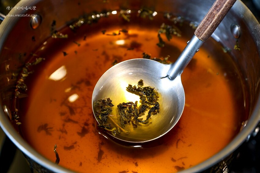 少見的文山包種茶變成主角,加上柴魚魚片熬湯增加風味,入口先感受到茶的清香,湯頭滋味甘醇令人回味,柴魚讓尾韻增加甘甜,非常好喝的湯頭,宜蘭人才喝一口就直呼超好喝。