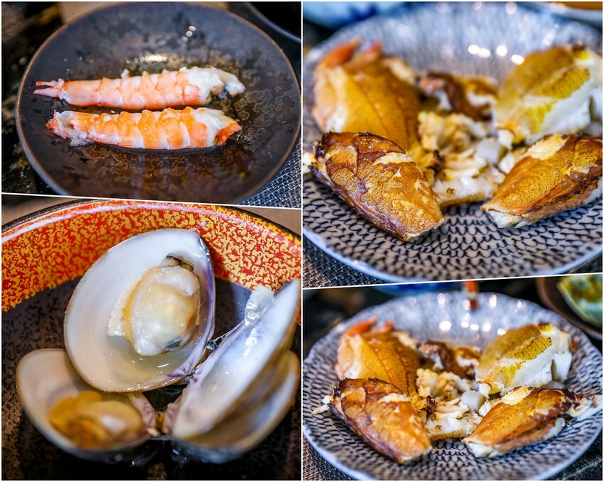 一旁還有活跳跳的蝦子和蛤蜊,以沈木裝飾帶有日式風格擺盤,讓我忍不住拍了超多張照片。