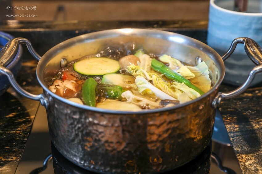 嚴選新鮮蔬菜並特別配色的擺盤,竟然還有我超愛的苦瓜,其他還有茄子、山藥、皇宮菜、杏鮑菇、舞菇、玉米筍、香菇、絲瓜、秋葵、娃娃菜、花椰菜、地瓜、彩椒和高麗菜等等,超過15種食材很滿足。