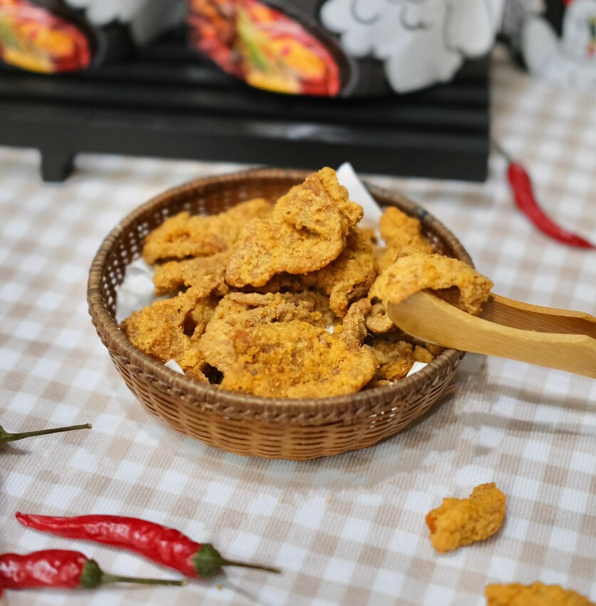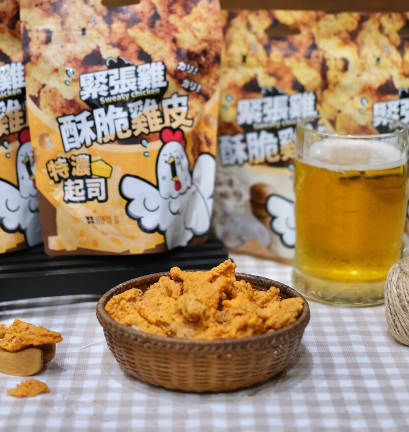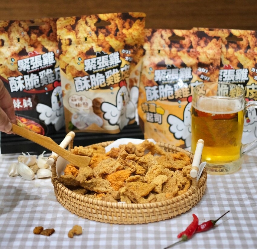 ▼不因為是零食就隨便馬虎,純手工新鮮現炸的「緊張雞酥脆雞皮」,選用100%土生國產雞皮製作,純手工去除雞皮上多餘油脂,再以獨家特製的調味醃製按摩,最後經過兩次回炸鎖住香味,繁複又耗時耗工成就出好滋味。