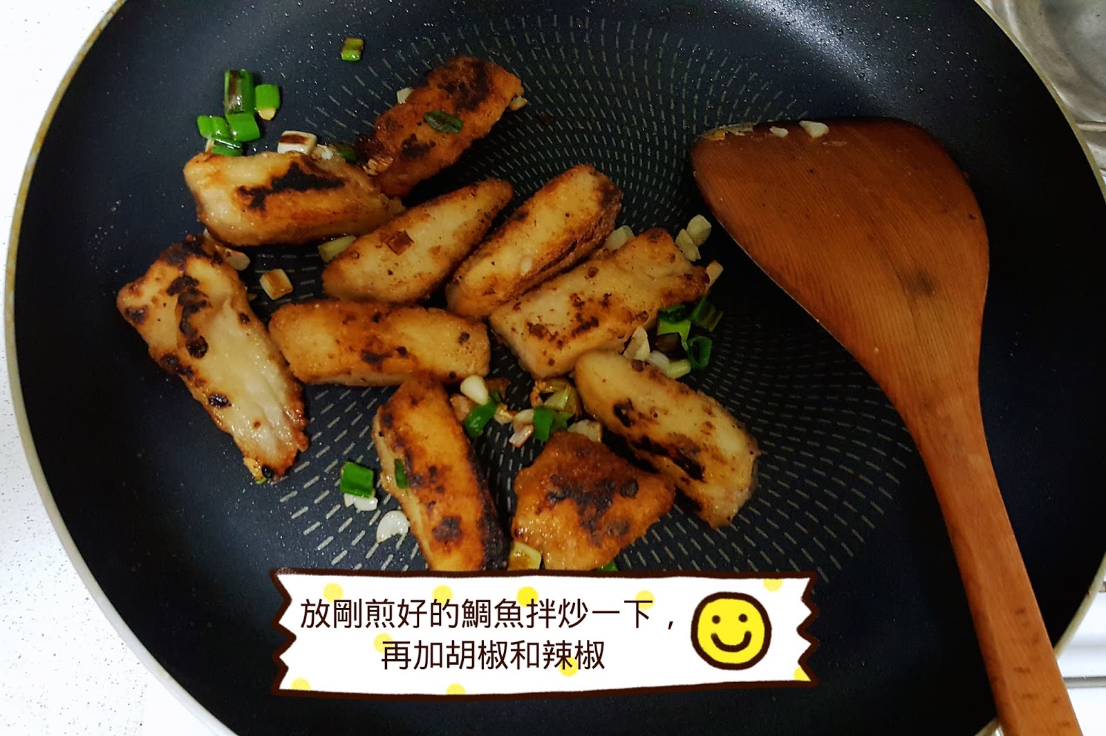 (2) 剛剛煎好的魚片放下去攪一攪。