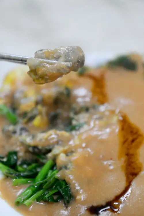 三兩下就把肉圓切塊,在淋上點綴肉圓靈魂的醬汁,