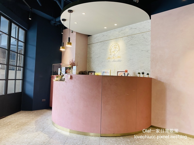 櫃檯是粉嫩色系耶~在整體沈穩的藍色背景裡很明顯