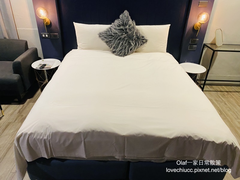 這間是灰藍紳士風格,床的墻改成木板