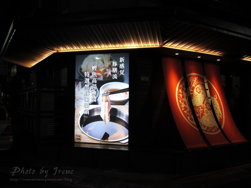 訂的是七點半的位子,但是打了燈的店家外觀配上黑夜特別的有氣氛,遠遠的就能看見燈箱上的豚膳流介紹,搭配上右側的紅色布幔,十分的醒目!