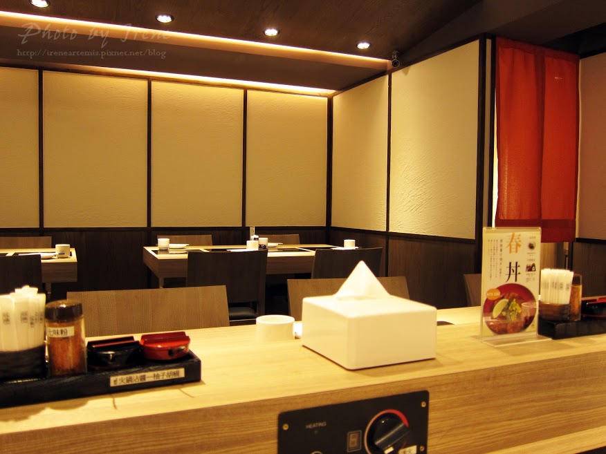豚膳裡的座位主要是四人桌、包廂以及相連的長條桌,中間巧妙的做了一個小島台,上面放著調味料、面紙、牙籤和小立牌,取用很方便,比起立上一塊隔板來說,這個選擇實在是高明的多!減少了和不認識的人對坐時的尷尬,也不會讓人覺得很壓迫。