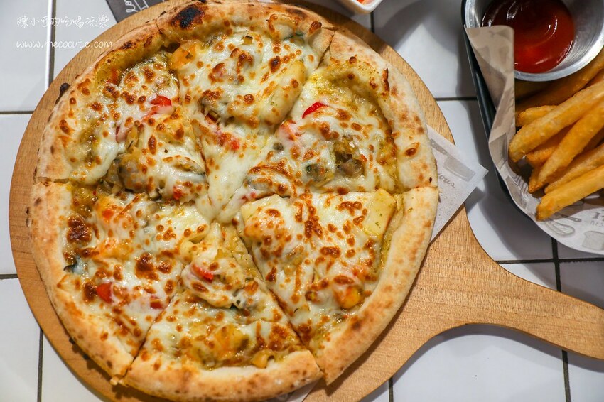 披薩外層口感軟Q,餅皮香氣十足令人回味,酸酸甜甜的泰式紅醬和九層塔、乳酪絲非常融合,海鮮主角有花枝、海瓜子和蝦仁,餡料豐富多層次,尤其是海瓜子超特別!