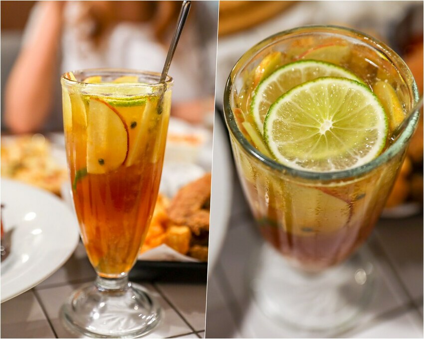 配色蠻豐富的新鮮水果茶,裡面有不少現切水果片,以百香果為基底, 甜度有點高,自己加了開水就剛剛好。