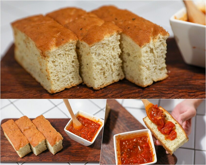 義式料理少不了佛卡夏,切塊的模樣好像蜂蜜蛋糕,外層烤的酥酥的,口感外脆內Q,越嚼越香,有著非常討喜的迷迭香風味和麥香。