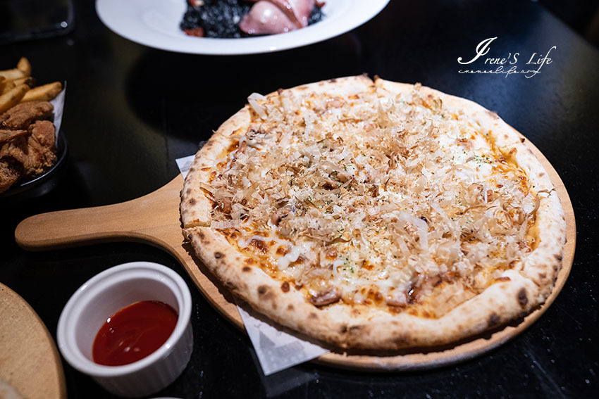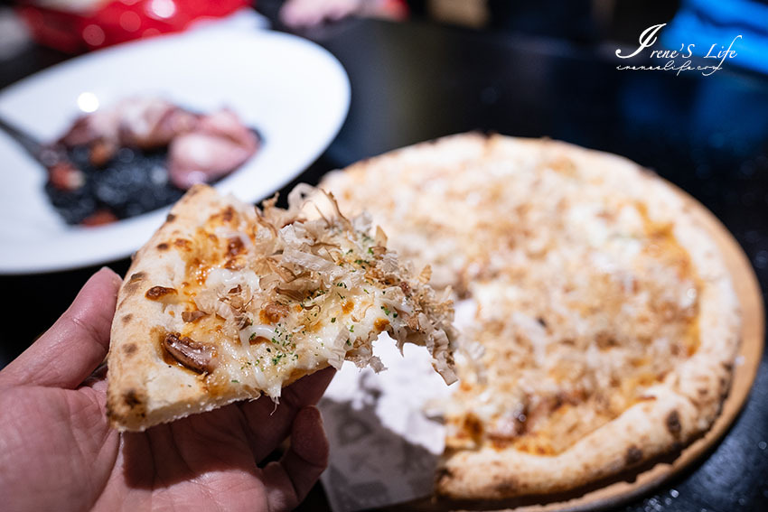 鋪上滿滿柴魚片的魷魚燒披薩,搭配海苔粉、照燒美奶滋醬,充滿日式風味,