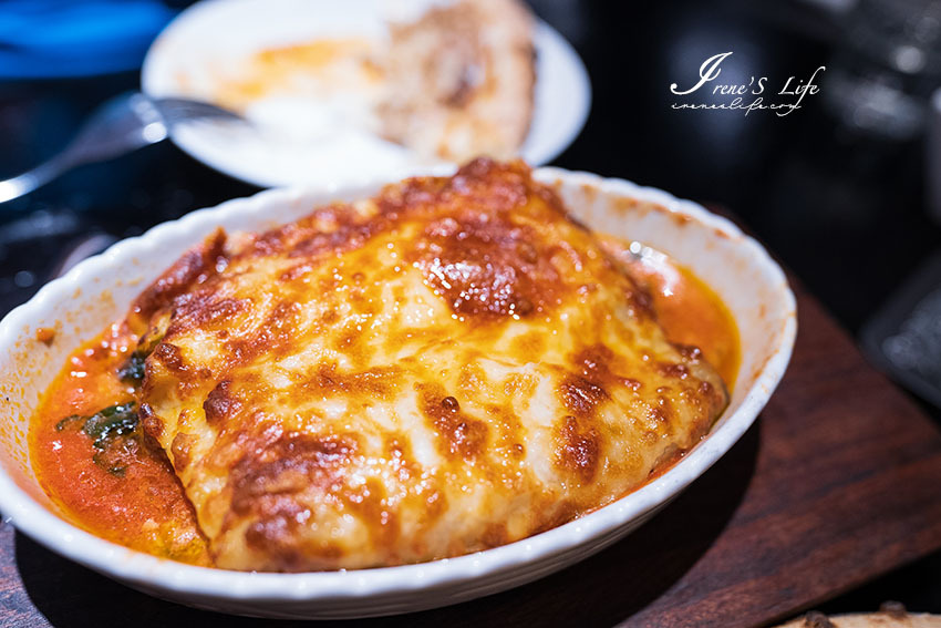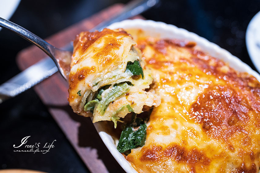 熱呼呼的波隆那菠菜肉醬千層麵(NT.329),要注意瓷盤很燙喲!