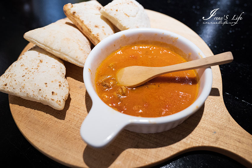 當晚雖然客滿但上餐的速度還挺快的,開胃點選了爐烤麵包佐番茄貽貝風味醬,