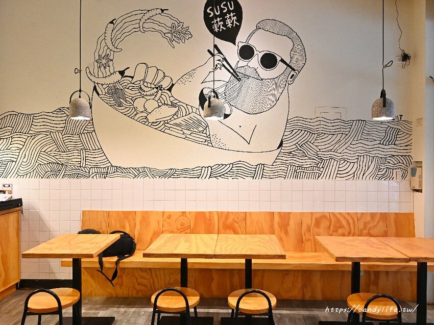 SUSU蔌蔌的內用空間不算大,不過座位不會讓人覺得太過擁擠,微黃燈光給人一種回到家的溫馨氛圍,店裡頭沒有過多花俏擺飾,簡單大方,搭配手繪插畫,文青又可愛