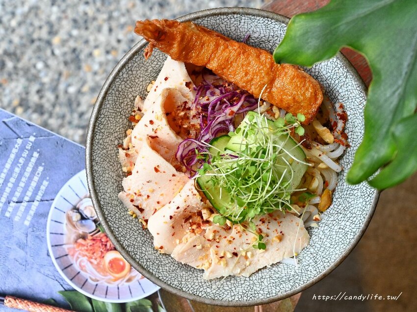 另一個港式米線糖糖點了涼拌口味,以日本進口胡麻醬為基底,裡頭加入了椒麻增添香氣,搭配堅果、小黃瓜、青花苗及低溫慢煮雞肉,糖糖還額外添加了鮮蝦腐皮卷