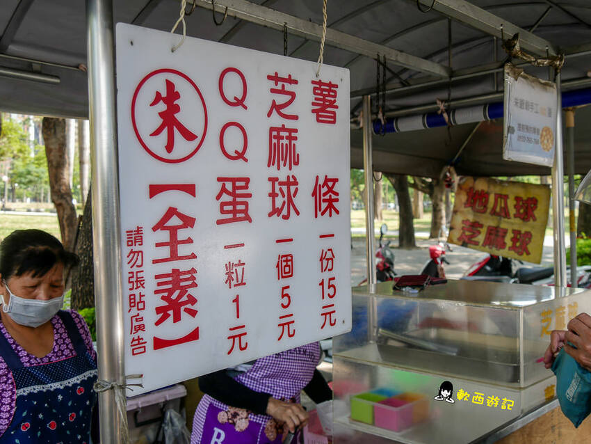 我已經相當盡力拍了攤位的側影,因為前面總是人潮滿滿,很難拍到沒人的場景阿哈哈,大大白底紅字招牌寫著價錢,朱爺爺QQ蛋可以提前用電話預約,但就今天軟西排隊購買的情況來看,還是直接來到現場買比較快啦哈哈,畢竟現場的姊姊們也都忙得不可開交,不管是QQ蛋或是芝麻球一鍋接一鍋地炸,只要一起鍋瞬間就被買光光。