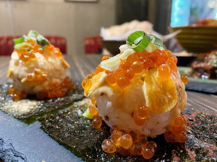 壽司飯淋上美乃滋,鋪上酥脆的蒜片,再放上鮭魚卵、蔥,一咬下去會先吃到酥脆蒜片的口感,來就是美乃滋跟飯,最後會知道爆汁的鮭魚卵!超好吃!清爽不油膩、不死鹹,吃完馬上推爆朋友來吃這一道(哈!)