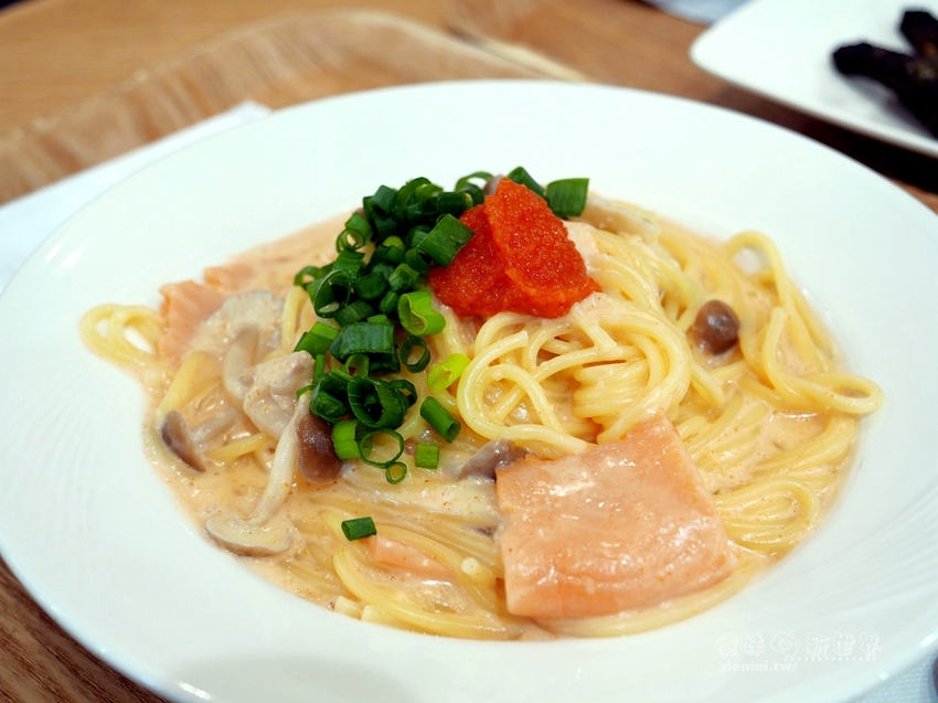 鮭魚細嫩、奶醬濃郁,因有明太子的鹹香與青蔥、野菇搭配所以完全不膩,