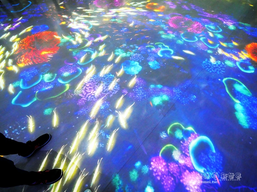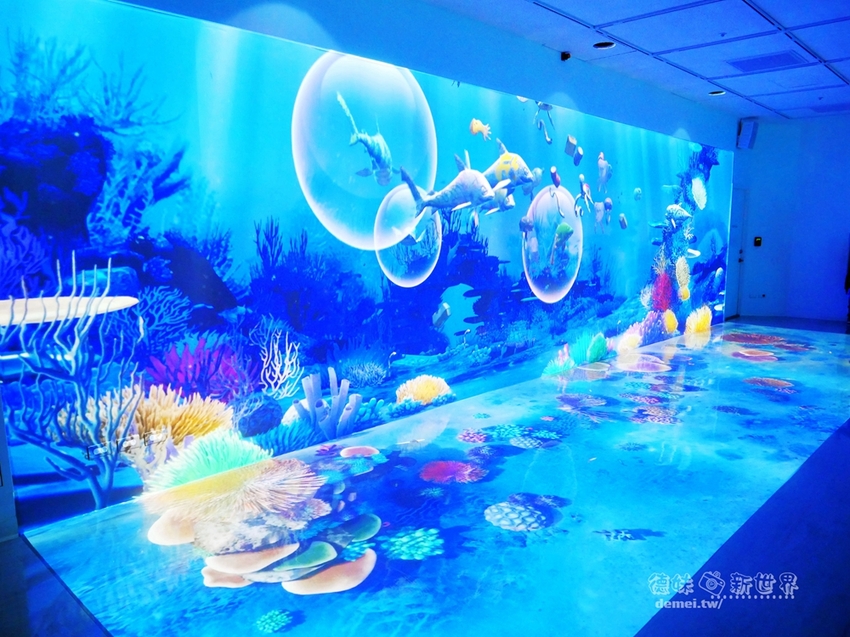 天花板投影出的魚群在繽紛珊瑚礁周圍嬉遊,不時於遊客腳邊穿梭而過,頗有互動感。