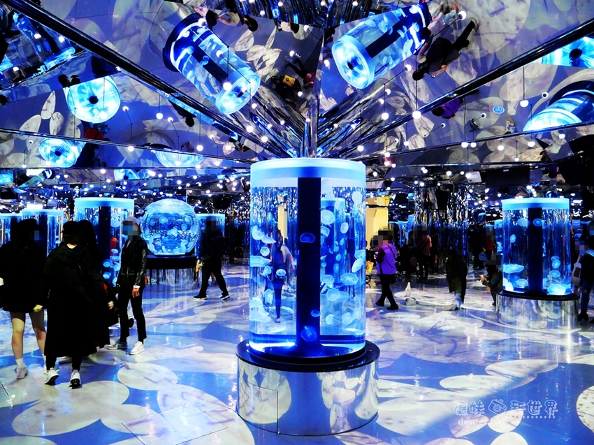 最後以各色虹光灑在透明柱體內的水母身上,以萬花筒的無邊鏡面創造出奇幻氛圍。