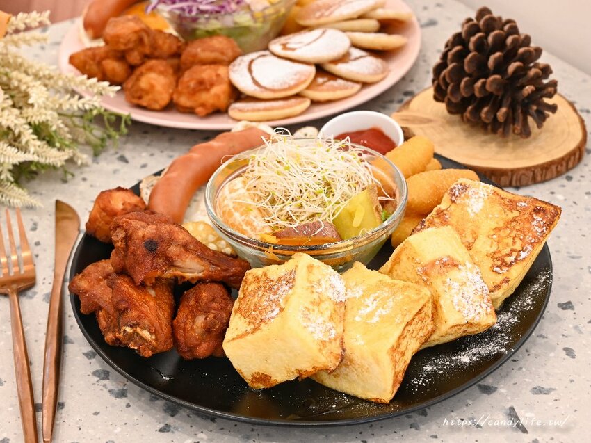 肉肉鬆餅裡頭包含手工日式炸雞、德式香腸、美式鬆餅、太陽蛋、薯棒、季節沙拉及飲品,整盤裝滿滿,看起來超澎派