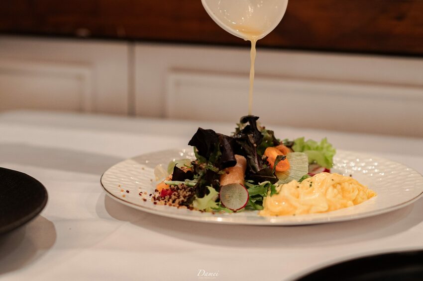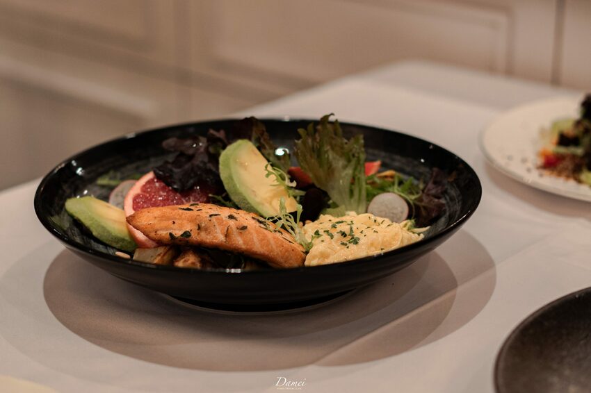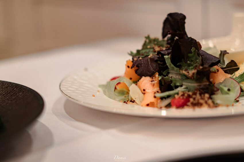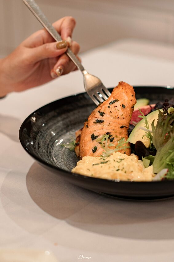 當我在品嚐這道沙拉料理時,我可愛那沙拉醬了!他並不是我們市面上常吃到的會油膩的口感,是相當清爽甚至會愛上的滋味,主廚選用檸檬與初榨橄欖油做調配,搭配軟嫩的煙燻鮭魚,讓整體風味提升且越吃越唰嘴。